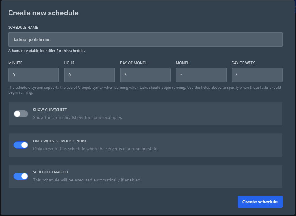 - Créez un schedule nommé Backup quotidienne